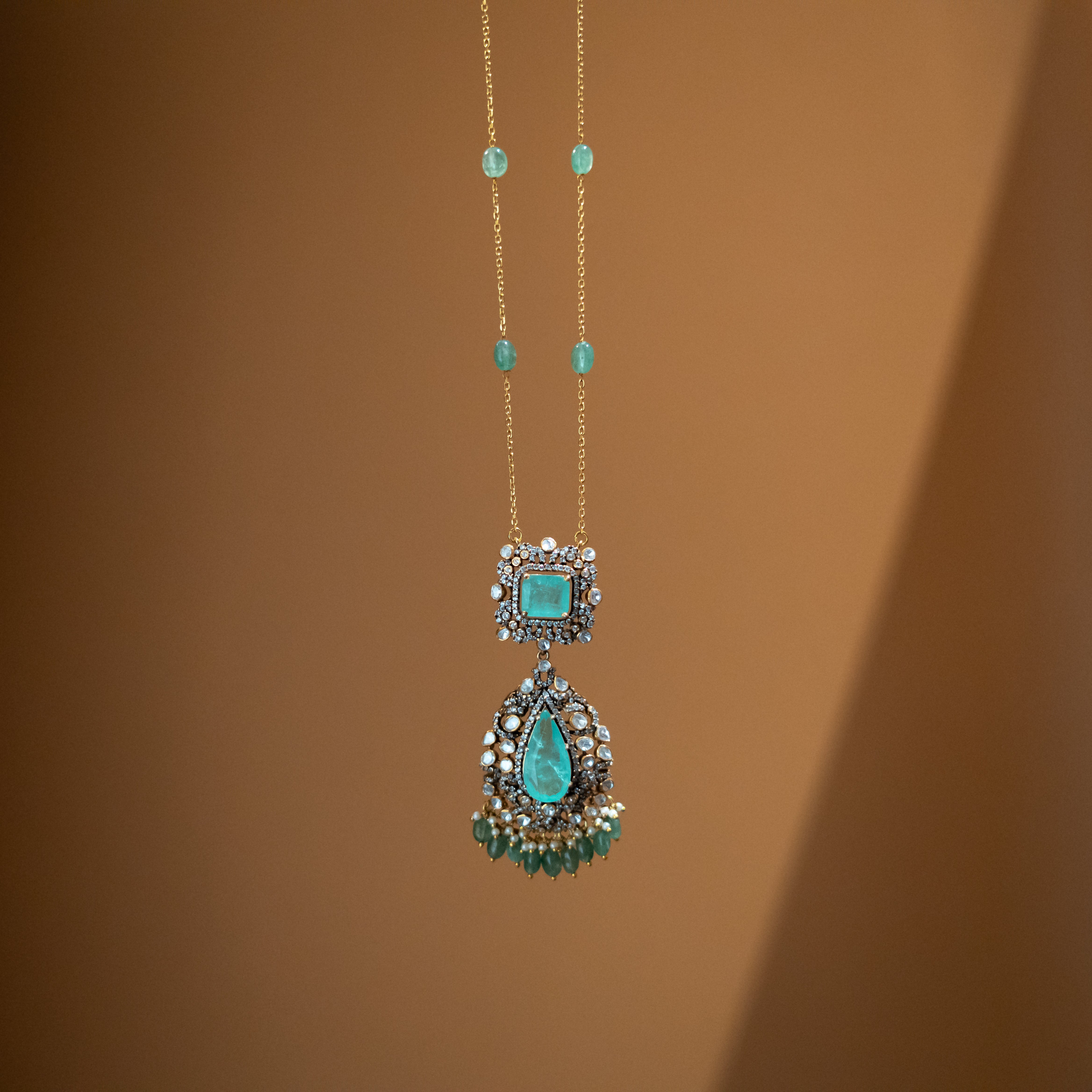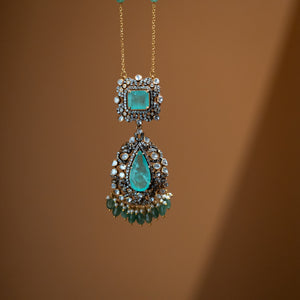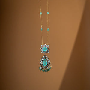 Celestine is a Victorian chain handcrafted in 925 sterling silver, adorned with intricate detailing and soft aqua-toned semi-precious stones. The layered pendant design adds depth and elegance, while the delicate chain keeps the piece refined and wearable. Timeless and graceful, Celestine captures old-world charm with a subtle modern touch perfect for both festive occasions and elegant everyday styling.
